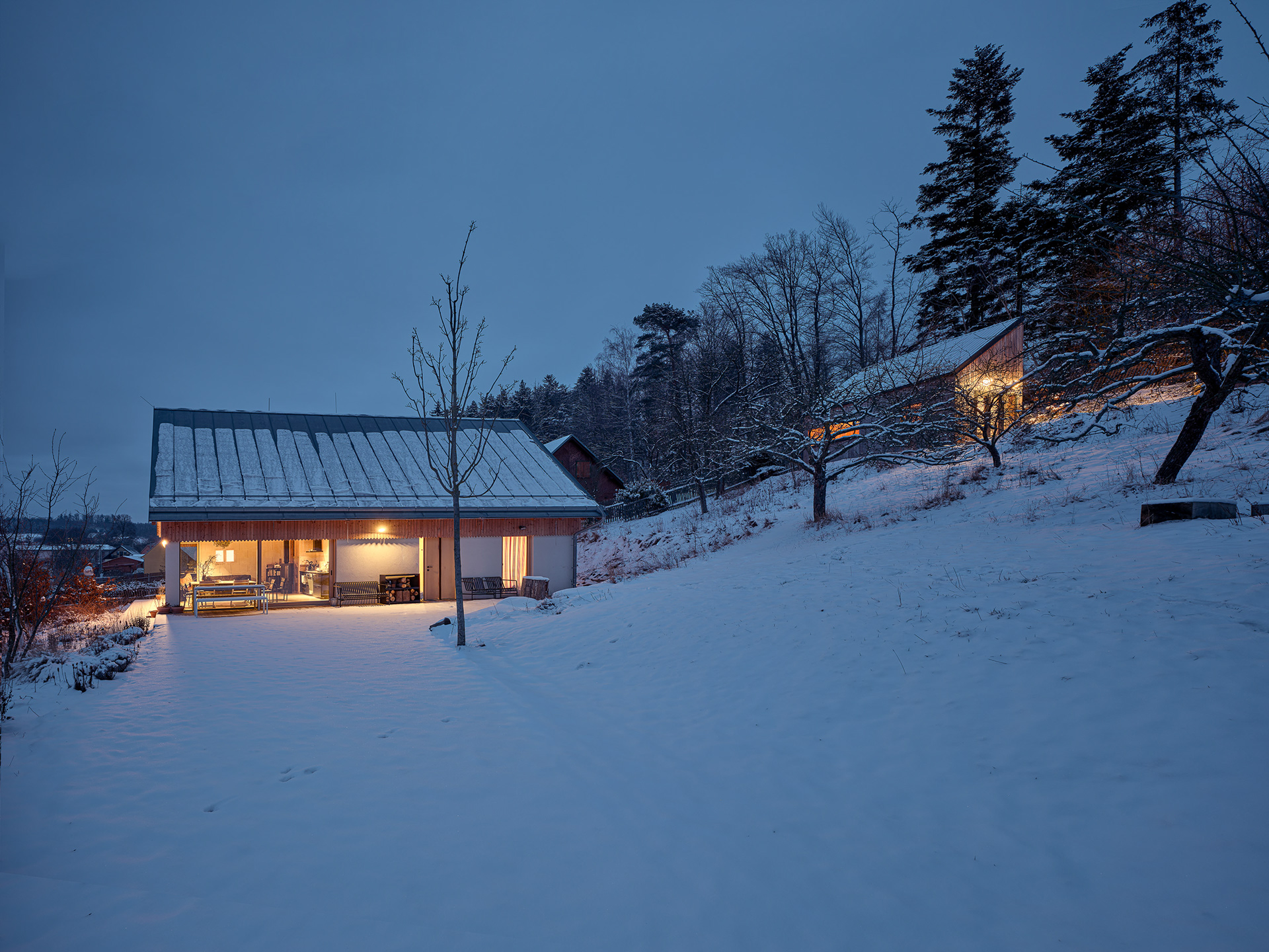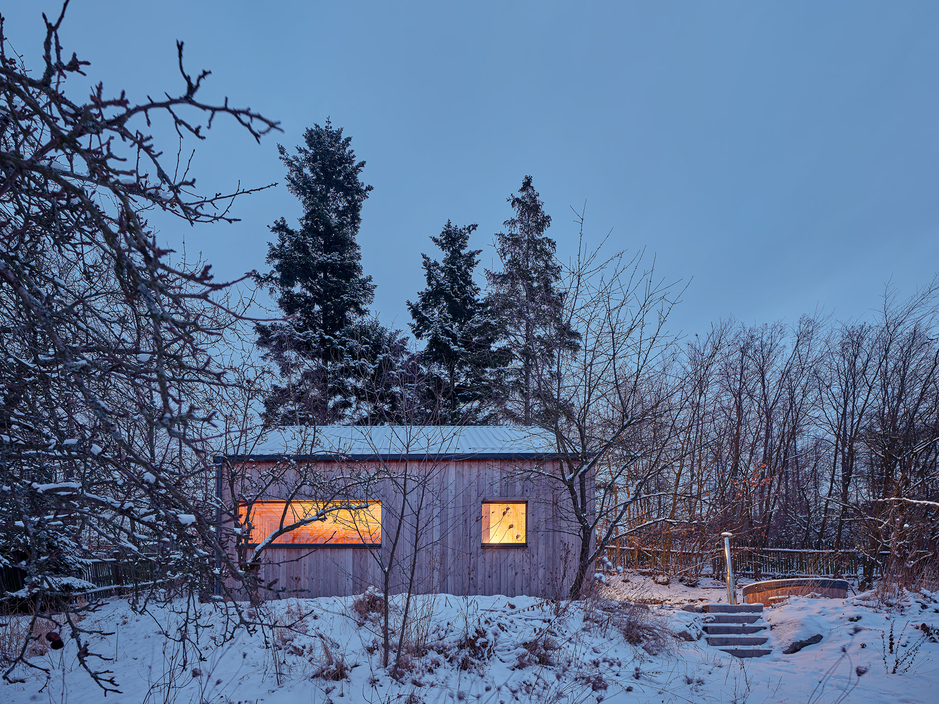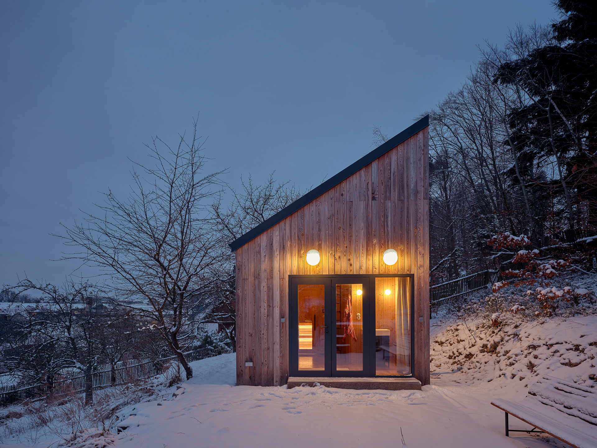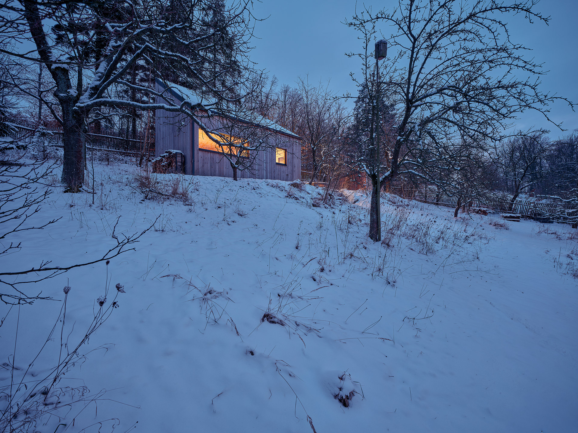 A few frames from an architectural realization in the Moravian Karst. A weekend house with a sauna, wrapped in silence and blue hour light.