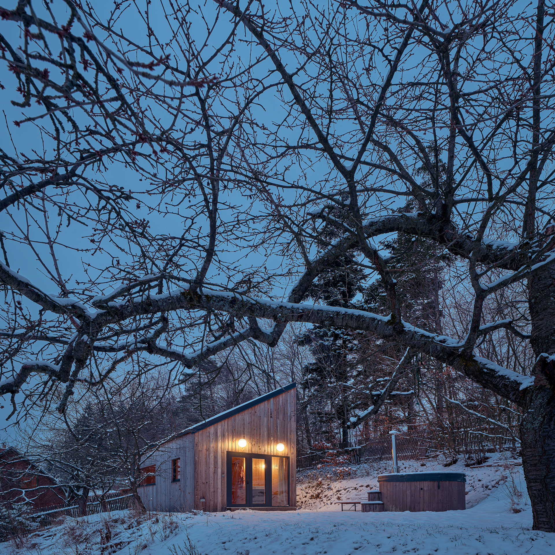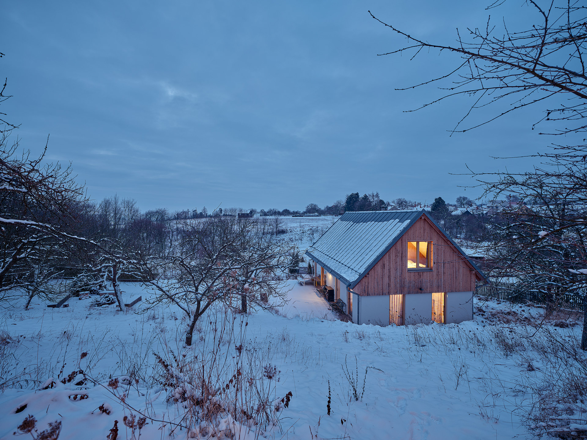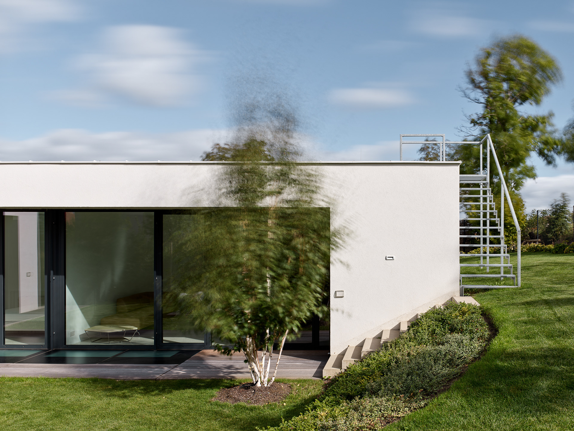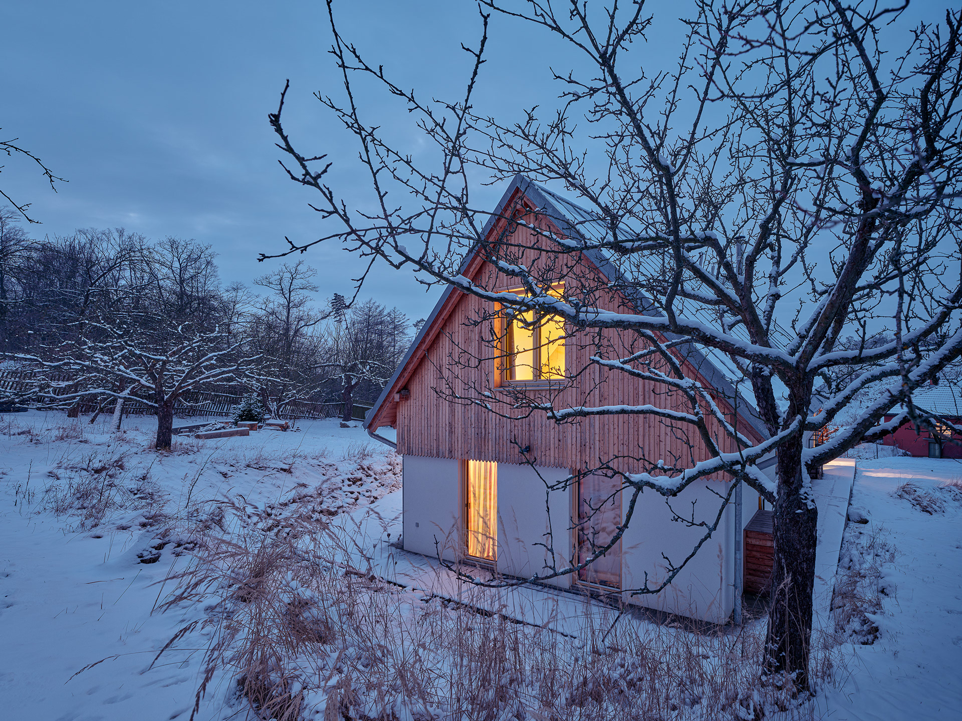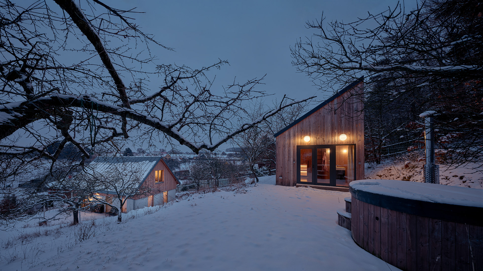 A few frames from an architectural realization in the Moravian Karst. A weekend house with a sauna, wrapped in silence and blue hour light.